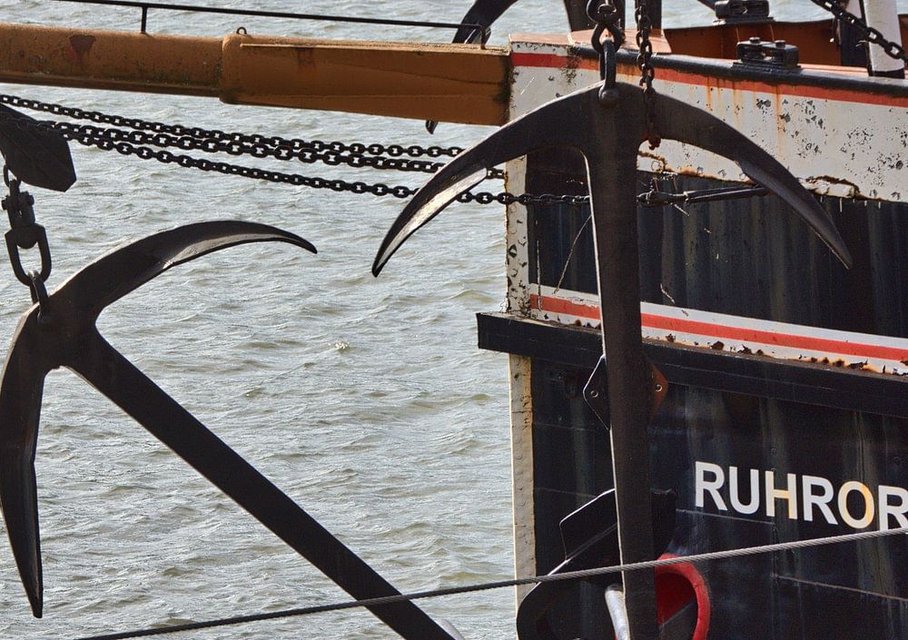 Zicht op de boeg van het stoomschip Oscar Huber op het Vinckekanaal in het Maritiem Museum in Duisburg Ruhrort.