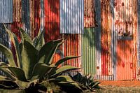 Grote agave tegen achtergrond met roestige golfplaten. Gefotografeerd in Zuid-Afrika.