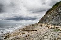 Zeezicht van de ruige kust van Normandië (Frankrijk), met steile hellingen en een rotsachtig plateau. De aanwezige donkere wolken hebben een mooie tekening en accentueren de sfeer van het landschap. De foto is genomen nabij Port-en-Bessin-Huppain.