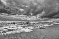 Regenbuien trekken over de ruige zee en het water stroomt langs de golfbreker aan Zeeuwse kust! Een lange sluitertijd opnamen legt de beweging van het water mooi vast.