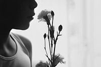 Jongen die aan een bloem ruikt. Detail. Fine art. Silhouet.