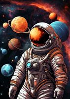In dit fascinerende portret staart een astronaut in een gestroomlijnd ruimtepak peinzend in de kosmos. Achter hen wervelt een prachtig sterrenstelsel met levendige kleuren, bezaaid met verre sterren, terwijl een majestueuze planeet in de buurt opdoemt, waarvan de ringen glinsteren. Deze scène belichaamt het wonder van exploratie en de schoonheid van het universum.