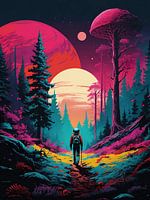 In dit kunstwerk worden astronauten afgebeeld die verdwaald zijn op buitenaardse planeten, omringd door vreemde landschappen en onbekende wezens. De achtergrond toont desolate, onherbergzame omgevingen met bizarre rotsformaties, kleurrijke flora en fauna die anders zijn dan alles wat we op aarde kennen.