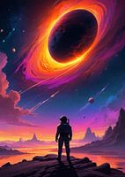 Een astronaut zweeft door de uitgestrektheid van de ruimte, omringd door de oneindige uitgestrektheid van wervelende sterrenstelsels, nevels en sterren. De ontzagwekkende schoonheid en afzondering van de kosmische wildernis contrasteren met de stilte van de leegte en roepen een gevoel van verwondering en onbeduidendheid op.