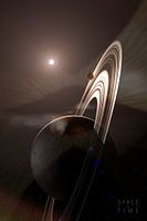 Een sci-fi afbeelding van een fantasie planeet met planetaire ringen en een nabijgelegen maan. Veel optische storingen.