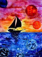 een kleurrijk aquarelkunstwerk van een klein zeilbootje dat over de horizon vaart op een surrealistische oceaan vol sterren en planeten, verlicht door een kleurrijke zonsondergang met verschillende planeten aan de hemel.