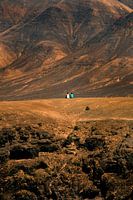 Twee mensen in een leeg landschap in het zuiden van Lanzarote, Canarische Eilanden