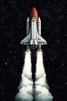 Midden in de oneindige duisternis van de ruimte stijgt een majestueuze spaceshuttle op met krachtige motoren en laat stralend witte wolken achter. Het glanzende oppervlak reflecteert het licht van verre sterren terwijl het vastberaden naar de horizon van het onbekende vliegt. Dit beeld belichaamt de onwankelbare menselijke drang om het universum te verkennen.