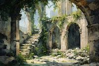 Ruïne Natuur Canvas - Het werk illustreert een verlaten bouwval, omarmd door natuurlijke elementen. Met een finesse in het licht- en schaduwspel, laat de schilder een scala aan grijsgroene en aardetinten zien. De stilering leunt naar een realistische weergave met een zachte, bijna impressionistische touch.