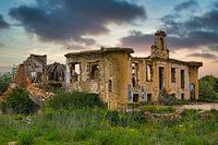 De foto toont de ruïne van de Torre Green Soul, een vervallen en beschadigd gebouw. De muren zijn aan het afbrokkelen en delen van het dak zijn ingestort. Rondom het gebouw is overwoekerde vegetatie te zien, waaronder gras en kleine struiken. De lucht op de achtergrond is deels bewolkt met een mix van donkere en lichte wolken, wat een naderende avond of vroege ochtend suggereert. Het tafereel is zowel schilderachtig als melancholisch, en vangt de schoonheid van verval en het verstrijken van de tijd.