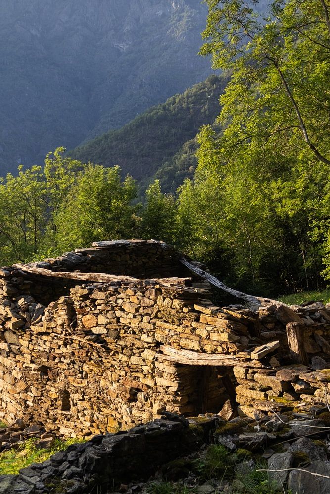Als de zon ondergaat boven Valle Cannobina in Italië, baadt het gouden licht in een oude ruïne die verscholen ligt tussen de bergen en rotsachtige hellingen. Het levendige groen van het gras en de bomen contrasteert met de ruige rotsen en het oude steenwerk, waardoor een prachtig natuurlijk tapijt ontstaat. De rust van de scène wordt versterkt door de uitgestrekte open hemel, waardoor het een echt sereen en pittoresk landschap is, in de buurt van Cannobio en de Italiaanse meren.