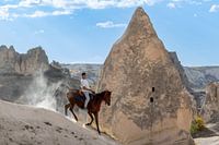 Een ruiter op zijn paard in het bizarre rotslandschap van Cappadocië in Turkije