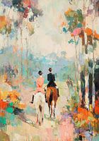 Een impressionistisch schilderij toont twee ruiters op witte en bruine paarden die naast elkaar rijden over een lichtgekleurd pad door een landschap van bomen. De ruiter links draagt een perzikkleurig bovenstuk en een donkere hoed, terwijl de ruiter rechts donkere kleding en een hoed draagt. De omgeving is in zachte pastelkleuren blauw,…