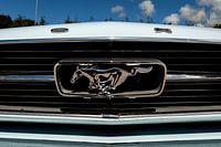Grill van een Ford Mustang met het rennende paard in de zomerse zon.