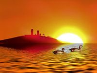 Fotomontage eines Sonnenunterganges an der Rungenberg Halde in Gelsenkirchen mit Wasser und Enten