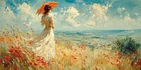 Een betoverend impressionistisch schilderij van een vrouw in een witte jurk, staand tussen wuivende klaprozen op een zonnige heuvel. Met een oranje parasol als levendig accent tegen een zonovergoten landschap met wolkenlucht, straalt het werk een tijdloze romantiek en vrijheid uit. De losse penseelstreken en warme kleurenpalet creëren een dromerige, nostalgische sfeer.