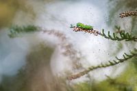 Op een vroege ochtend zat deze groene rups van de roodbont heide-uiltje prachtig op de bloeiaren avn een heidestruikje. Dit is een rups van een nachtvlinder die voor voorkomt op de Veluwe. Deze foto is gemaakt op de Veluwezoom.