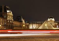 Door de langere sluitertijd lijken de auto's het Louvre in Parijs voorbij te flitsen in de nacht.