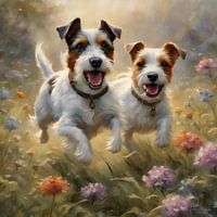 Dit levendige en grillige digitale kunstwerk vangt de vreugde van een Russell Terrier die in een veld met wilde bloemen speelt. De speelse uitdrukking en energieke lichaamstaal van de hond zijn perfect vastgelegd en de heldere en vrolijke kleuren van de bloemen creëren een gevoel van geluk en zorgeloos plezier.
