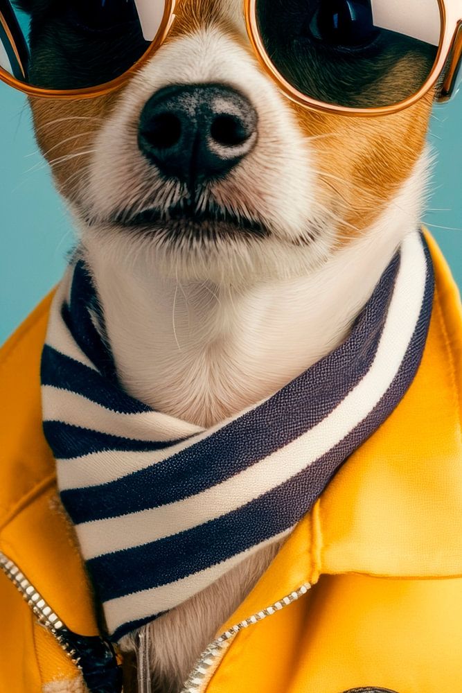 Met een coole zonnebril die een vleugje glamour toevoegt en een felgele outfit straalt deze Russell Terrier puur zelfvertrouwen uit. Zijn onwrikbare blik en vrolijke oren onthullen een speelse geest die klaar is om de wereld te veroveren - net als een klein mode-icoon!