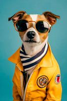 Met een coole zonnebril die een vleugje glamour toevoegt en een felgele outfit straalt deze Russell Terrier puur zelfvertrouwen uit. Zijn onwrikbare blik en vrolijke oren onthullen een speelse geest die klaar is om de wereld te veroveren - net als een klein mode-icoon!
