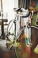 Gekleurde bokeh op een vintage, sepia foto van een wielrenfiets.