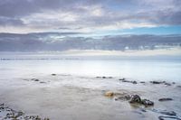 Prachtig rustig weer op het Wad bij Wierum. Door de bewolking is er bijna geen onderscheid meer te zien tussen de Waddenzee en de lucht. Daardoor lijkt het bijna een eindeloos vergezicht. Op de voorgrond van de foto zijn stenen te zien welke in de zee liggen.