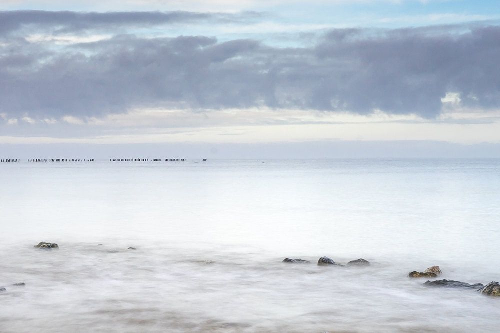 Prachtig rustig weer op het Wad bij Wierum. Door de bewolking is er bijna geen onderscheid meer te zien tussen de Waddenzee en de lucht. Daardoor lijkt het bijna een eindeloos vergezicht. Op de voorgrond van de foto zijn stenen te zien welke in de zee liggen.