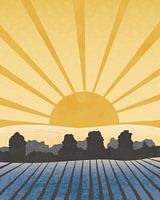 Minimalistisch landschap met velden op de voorgrond, die zich uitstrekken tot een bos. Achter het bos zijn er meer velden te zien en op de achtergrond de opkomende zon met iconische zonnestralen. De kleuren geel en oranje staan voor de warmte van de zon, terwijl de kleuren blauw en grijs de koele lucht en de schaduwen van de nacht aanduiden. Verschillende grafische elementen en texturen zorgen voor interessante effecten.