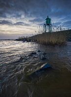 Deze prachtige foto vangt het moment waarop water, lucht en land samenkomen in een betoverende symfonie van kleuren en texturen. De nadruk ligt op een iconische groen havenlicht, die trots oprijst boven een met riet omgeven dijk, terwijl het water van het meer zachtjes tegen de rotsen aan klotst. De dramatische wolkenhemel voegt diepte…