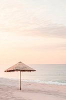 Een eenzame parasol rust zacht op het zachte, witte zand terwijl de golven zachtjes over de kust kabbelen. De pastelkleurige lucht kondigt de avond aan en vult het landschap met een sfeer van kalmte en melancholie - de perfecte plek voor een moment van rust en dromen.
