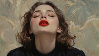 De gesloten ogen en dieprode lippen van de vrouw zijn als een stilleven van rust en extase, een samensmelting van kleur en emotie die zowel rust als passie oproept.
