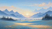 De bergen, met hun robuuste silhouetten en kalme aanwezigheid, strekken zich uit aan de horizon en bieden een gevoel van diepte en oneindigheid. De voorgrond wordt verlicht door een laag ochtendmist die de velden van hoog gras en wilde bloemen omhult, waardoor de natuur ontwaakt in een vredige, bijna magische sfeer.