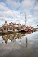 Een windstille dag zorgt voor een spiegelend wateroppervlak in de binnenhaven van het Friese stadje Makkum aan de IJsselmeerkust.