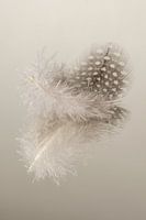 "Rust in een landelijke sfeer in lichte bruintinten: Een parelhoenveertje" is een macrofoto van een klein veertje van een parelhoen dat op een spiegelend oppervlak ligt. De kleuren in dit werk zijn over het algemeen lichte bruintinten, zoals taupe en beige, die een warme landelijke sfeer geven aan het werk.
