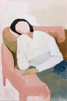 Een abstracte compositie in zachte, rustgevende tinten waar een figuur in wit gehuld rust op een roze oppervlak. De vloeiende penseelstreken creëren een serene sfeer, terwijl het kleurenpalet van pastelroze, groen en blauw een harmonisch geheel vormt. Het werk straalt een gevoel van rust en contemplatie uit, met een moderne interpretatie van het klassieke rustende figuur thema.