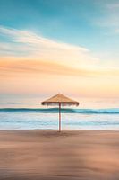 Zachte golven strelen het fijne zandstrand, terwijl een eenzame parasol in het warme licht van de ondergaande zon staat. De lucht schittert in zachte pastelkleuren en creëert een vredige sfeer. Hier, waar zee en lucht elkaar ontmoeten, lijkt de tijd stil te staan - een plek van rust en toevlucht.