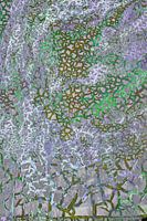 Een metalen roestige plaat, een open patroon, digitaal bewerkt tot een abstracte afbeelding. Uitgebeeld is een tegenstelling tussen rust en beweging.