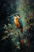Op een ranke tak, omringd door frisgroene bladeren en rode bessen, zit de ijsvogel stil en alert. Zijn felblauwe en oranje veren lichten prachtig op tegen de donkere achtergrond, waardoor hij haast een juweel van de natuur lijkt. Dit kunstwerk vangt zowel de schoonheid als de kalme kracht van de ijsvogel en brengt een vleugje…