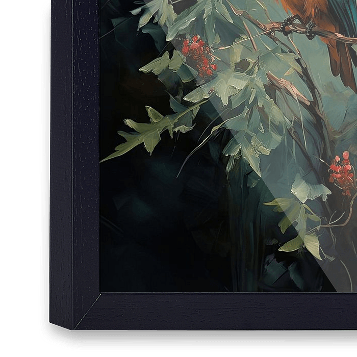 Op een ranke tak, omringd door frisgroene bladeren en rode bessen, zit de ijsvogel stil en alert. Zijn felblauwe en oranje veren lichten prachtig op tegen de donkere achtergrond, waardoor hij haast een juweel van de natuur lijkt. Dit kunstwerk vangt zowel de schoonheid als de kalme kracht van de ijsvogel en brengt een vleugje…