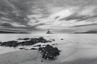 Een dramatisch, fine-art zwart-wit landschap met de vuurtoren Faro di Bocca op Sardinië, geïsoleerd in een kalme zee. De lange belichtingstechniek egaliseert het water tot een glasachtige textuur, die prachtig contrasteert met de gekartelde rotsen op de voorgrond en de weidse wolken met textuur. Perfect voor moderne interieurs of…