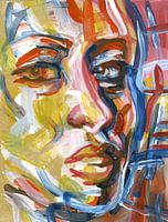 Portret van een vrouw. Het gezicht is opgezet in ruwe, vlotte penseelstreken. Er is een suggestie van een drukke omgeving waarin de kalmte bewaard wordt.