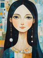 Details: vrouwenportret, moderne kunst, pastelkleuren, serene uitstraling, grote ogen, abstracte achtergrond, vredig, expressief, donker haar, gezichtsportret
