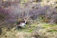 Een groot damhert ligt uit te rusten in de duinen, in een relatief kaal winters landschap.