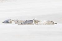Een groepje rustende Gewone zeehonden op het strand tijdens harde wind. Lichte kleuren, rustig beeld.