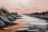Dit indrukwekkende kunstwerk combineert een serene rivier met een vleugje abstracte expressie. De zachte, koperachtige tinten weerspiegelen perfect in het water, terwijl de omliggende bomen en rotsen een rustige sfeer creëren. De monochrome accenten in combinatie met de warme roze lucht maken dit werk een perfecte aanvulling voor moderne en minimalistische interieurs. Het roept zowel kalmte als elegantie op en is een echte blikvanger in elke ruimte. Ideaal voor liefhebbers van natuur en abstracte kunst.