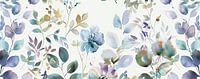 De kleuren zijn zacht en variëren van lichtblauw en groen tot tinten paars en beige, met een vleugje warme tinten die zorgen voor een evenwichtige compositie. Elke bloem en elk blad heeft een delicate, transparante kwaliteit, alsof ze met een fijne penseelstreek in aquarel zijn aangebracht. De witte achtergrond versterkt de frisheid en helderheid van de elementen, waardoor de natuurlijke vormen nog beter tot hun recht komen. Het werk lijkt de lente te vangen, met een lichte wind die de bloemen zachtjes laat bewegen.