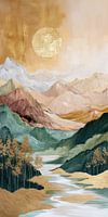 Dit landschap straalt een diepe, verstillende rust uit, waarin natuur en licht samensmelten tot een evenwichtig geheel. De bergen liggen in zachte lagen over elkaar heen, hun vormen vloeiend en zonder scherpe tegenstellingen. Koele groentinten en blauwgrijzen in de voorgrond gaan geleidelijk over in warmere aardekleuren en gouden…