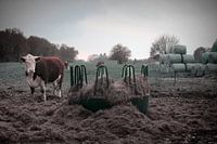 Deze serene foto toont een blaarkopkoe die rustig graast in de weide van Onlanden. Omringd door hooi, gras en bomen in prachtige herfstkleuren, straalt deze landelijke scène een gevoel van rust en harmonie uit. Het tafereel vangt de essentie van de natuurlijke schoonheid en eenvoud van het platteland.