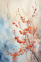Rustgevende Takken - Het kunstwerk toont vertakkingen van een boom of struik met ronde oranje tot roodachtige vruchten. De stijl is impressionistisch met een aquareltechniek, waarbij de kleuren zachtheid uitstralen en een ongedefinieerde achtergrond van blauwe en bruine wazige tonen creëren, wat een dromerige sfeer geeft.